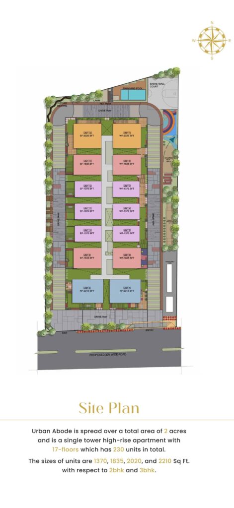 Urban Abode is spread over a total area of 2 acres and is a single tower high-rise apartment with 17-floors which has 230 units in total. The sizes of units are 1370, 1835, 2020, and 2210 Sq Ft. with respect to 2bhk and 3bhk.