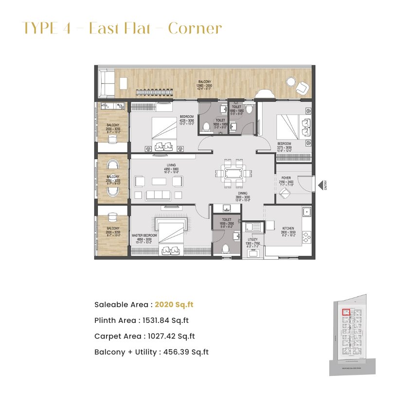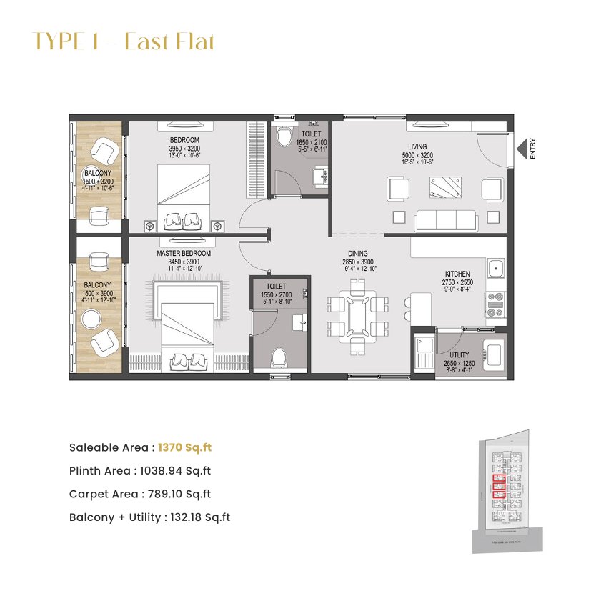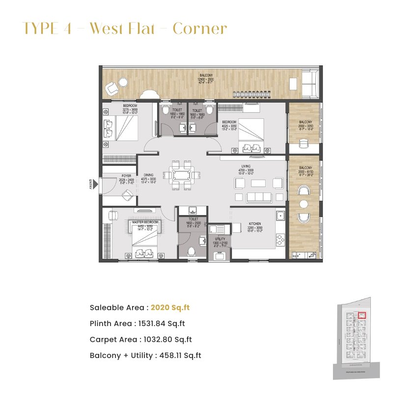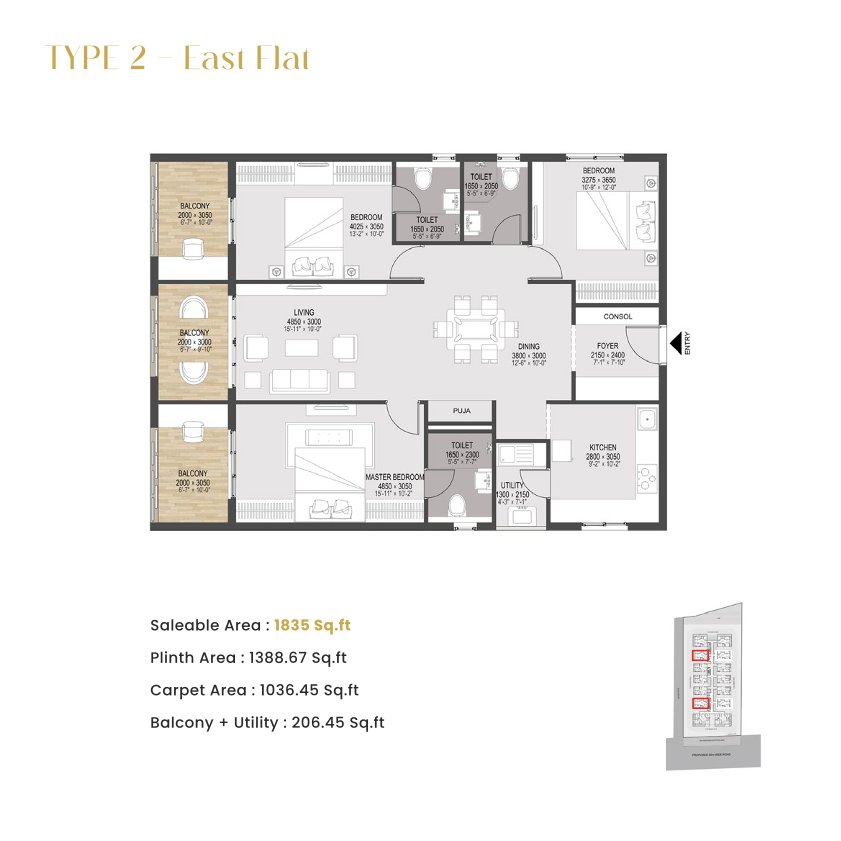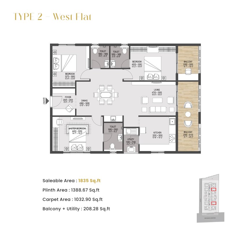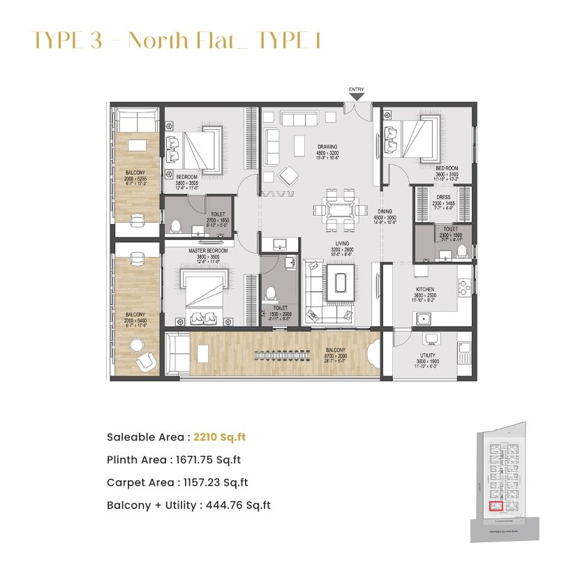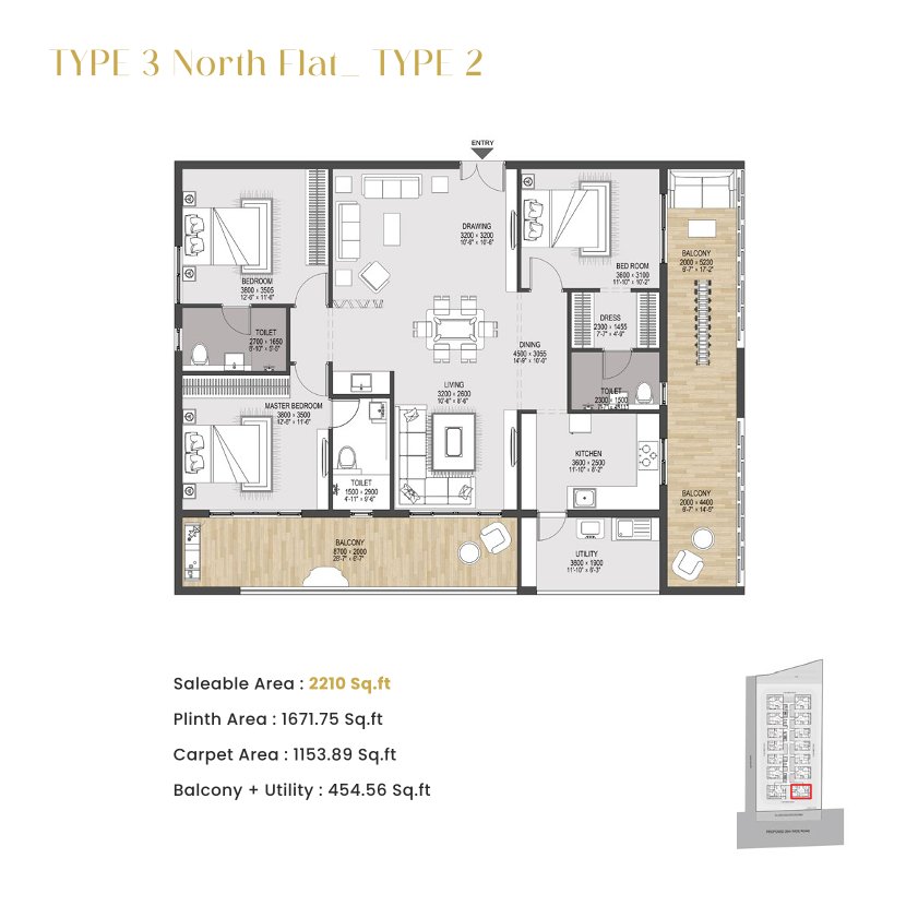 3 BHK (1835, 2020, 2210 Sq. Ft.) – A perfect blend of space and sophistication, offering a luxurious master bedroom, expansive living and dining areas, and a balcony to enjoy the lush surroundings.